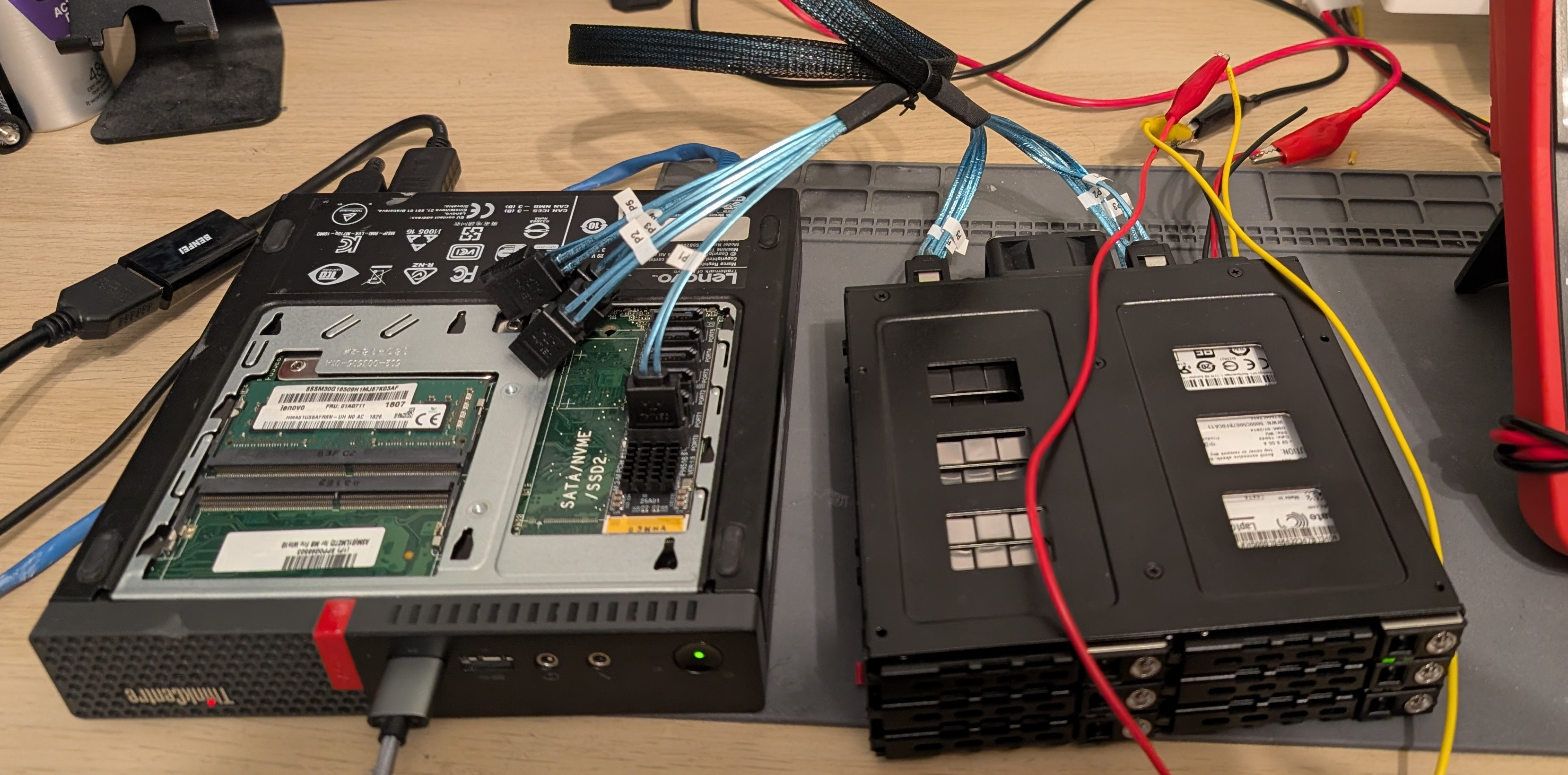 Once the mini PC arrived, I needed to figure out how to connect some more hard drives to it. The microserver had a 4 bay SATA backplane which I'd been using for a ZFS array. With the new setup, I wanted a way to expand this so that I could use RAIDZ2. I opted for a 6 bay backplane, connected using an NVMe SATA controller: