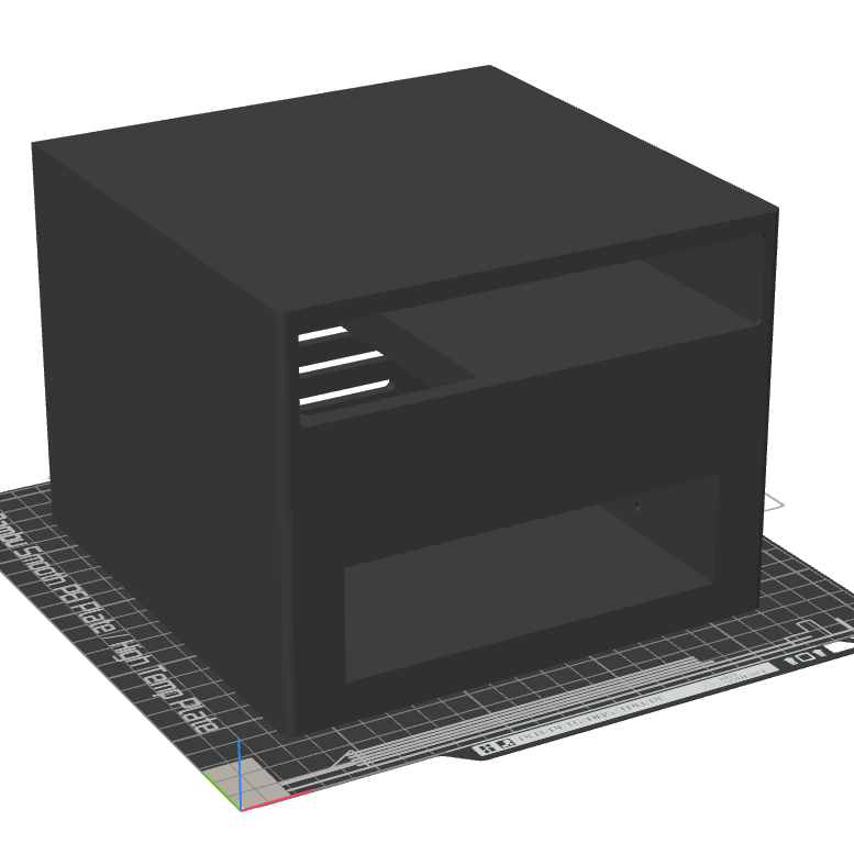 Despite appearances to the contrary in the image above, I can't print this in one piece on my BambuLab A1 Mini, so I split the main case into 3 parts. This leads to some ugly glue joints, but I'm not too concerned about that given the thing lives in a rack full of other things that aren't aesthetically pleasing. If there is ever a situation where that bothers me, I may look into experimenting with filler and paint to smooth these out. I also have some joints that aren't completely aligned due to the warping that always ocurrs when 3D prints cool.
