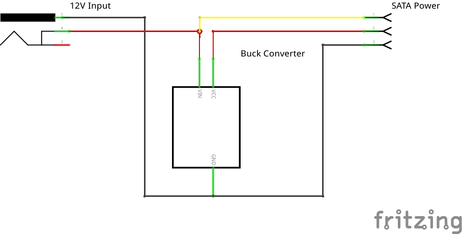 The only major issue to solve now was the somewhat annoying way SATA drives are powered. I wanted to use a single power supply to minimise cable mess in the rack, but SATA drives need both 12v and 5v rails. It's worth noting that for the most part with 2.5" drives, you'll get away with only powering the 5v rail, but some features of the backplane I bought also require the 12v rail to be present. Plus I figured I have no idea what drives I might put in this thing in the future, and I'm told some drives do require 12v power. To work around this, I bought a high power buck converter (6 drives could theoretically draw somewhere around 12A at spin-up, although I suspect that's unlikely to be for any sustained period of time) and built the following circuit: